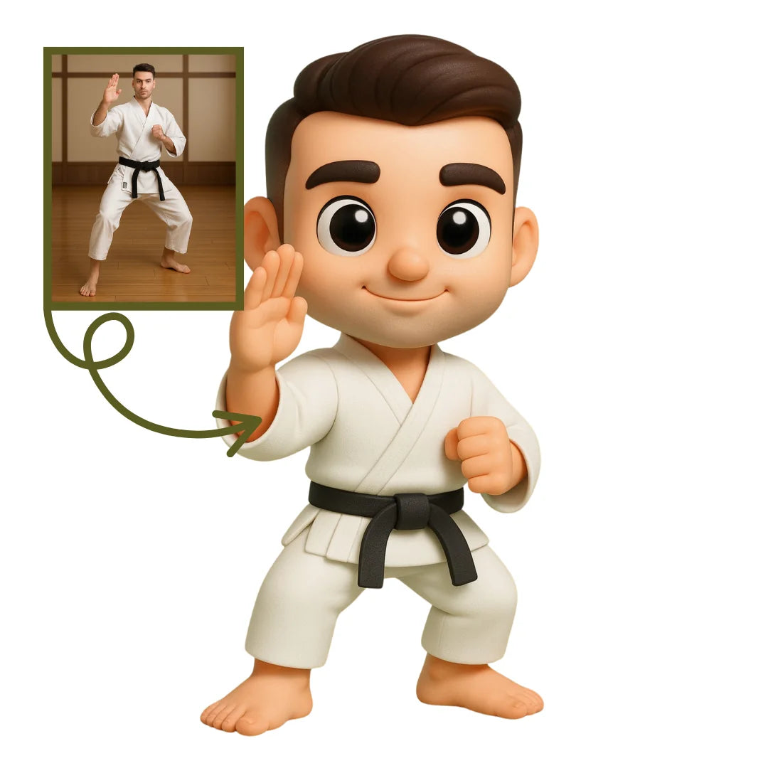 Spor disiplinini ve mücadele ruhunu yansıtan Karateci Figürü, karate tutkunları için özel olarak tasarlanmıştır. Bu figür, tek bir fotoğraf ile kişiselleştirilerek, beyaz karate gi ve kuşak detaylarıyla karikatürize bir 3D figüre dönüştürülebilir. Dinamik pozu ve özgün tasarımı sayesinde, masaüstünde dekoratif bir obje olarak veya sporseverler için eşsiz bir hediye olarak öne çıkar.